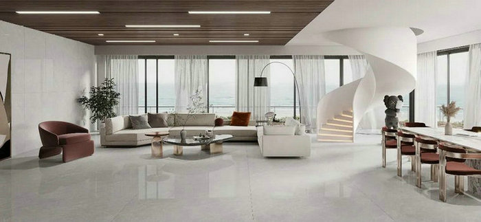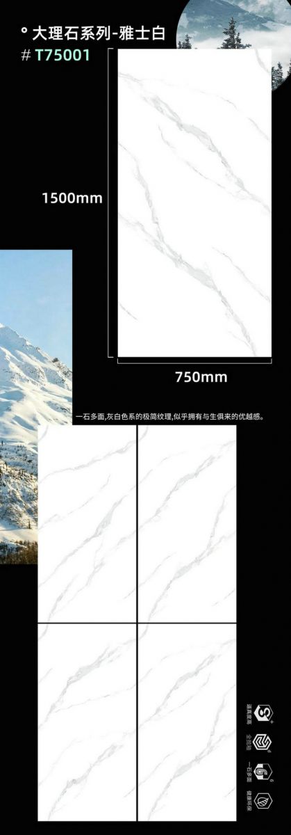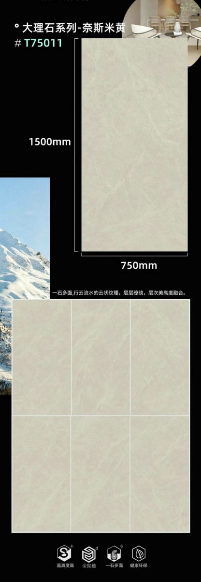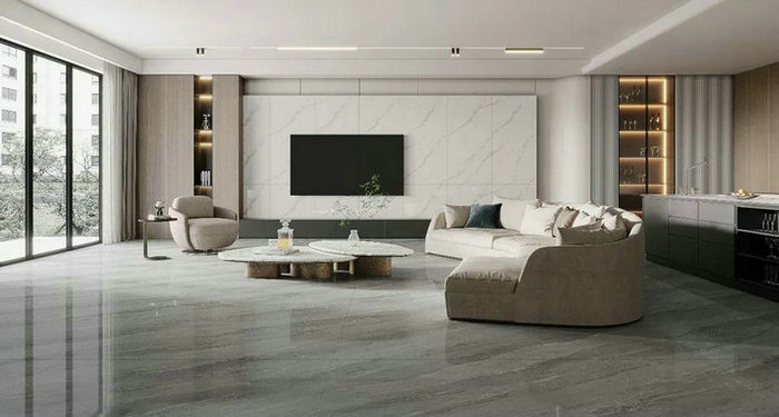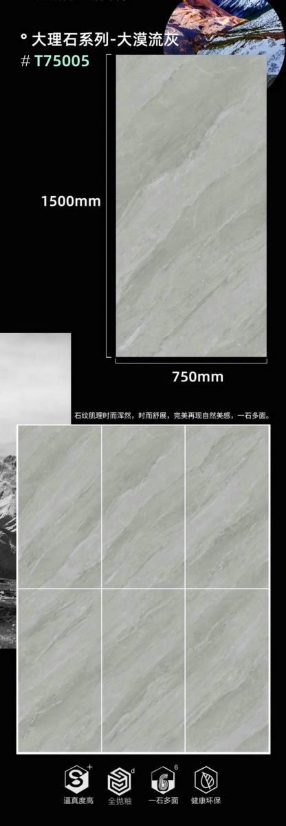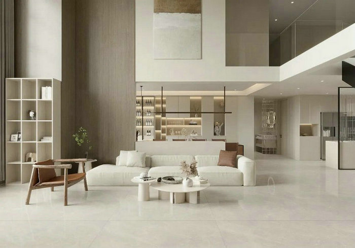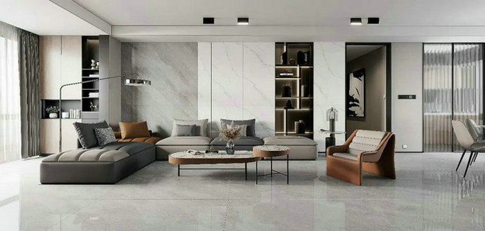 设计师可根据需要,对750X1500mm通体大理石瓷砖自由切割,能满足独特设计的现代居室需求。750X1500mm大板,实际应用领域更广泛,可应用于地面、墙面、茶几、桌面、橱柜、洗手台、灶台等装饰,无论是家装,还是在星级酒店、政企工程、豪华会所、别墅等高档场所,都能完美呈现高端大气的装饰效果。