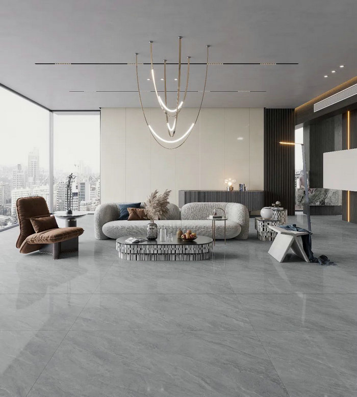 ▲通体大理石瓷砖 L75018 爱登灰 客厅地面应用